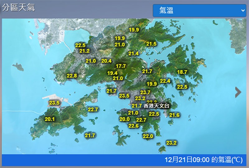 即時熱點 天氣|今日天晴乾燥 市區最高氣溫料25°C 聖誕節料早晚清涼 (09:12) 發佈於 2 天 前 2025 年 12 月 21 日 By 明報 早上9時天文台錄得氣溫21.7°C,相對濕度82%。本港地區今日(21日)天氣預測:大致天晴。日間溫暖及乾燥,市區最高氣溫約25°C,新界再高一兩度。吹和緩東北風,稍後離岸及高地風勢間中清勁。展望周一(22日)及周二(23日)初時風勢較大,氣溫稍為下降。周三(24日)日間溫暖。周四聖誕節(25日)早晚清涼,日間乾燥。(天文台) 相關文章:天文台天氣天氣速遞編輯推介 Up Next 本地馬友變身地中海名菜 (09:00) 不要錯過 短片:輪椅人士升上太空成首例 (16:06) 繼續閱讀 贊助商 猜你喜歡 天氣|天文台:日間部分時間有陽光 最高22°C (08:32) 天氣|平安夜料溫暖 聖誕節市區氣溫最低15°C Boxing Day 14°C (20:15) 天氣|天文台:日間乾燥及溫暖 最高25°C (09:46) 天氣|天文台:日間部分時間有陽光 最高23°C (08:46) 天氣|天文台:日間乾燥 晚上漸轉多雲 (08:20) 天氣|天文台:日間乾燥溫暖 最高25°C (08:14)