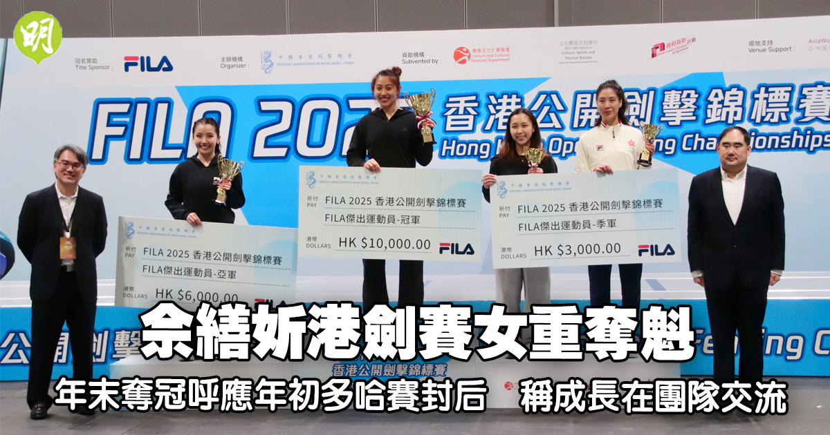 世界排名第4的佘繕妡上月在全運會摘下銅牌後,本月初於重劍世界盃溫哥華站女子個人賽16強止步。她今在香港公開賽分組賽豪取六連勝,以頭號種子身分晉級,首圈輪空下一路過關斬將,接連淘汰連翊希、黎曉瞳等劍手,與港隊隊友朱嘉望會師決賽,後者以6號種子出線,至4強更以15:9擊敗陳渭泠。來到決賽,佘繕妡全程掌控局面,終以15:5大勝,強勢奪冠;小將吳海諦則鏖戰至「決一劍」以12:13憾負中華台北劍手陳力寧,意外32強止步。