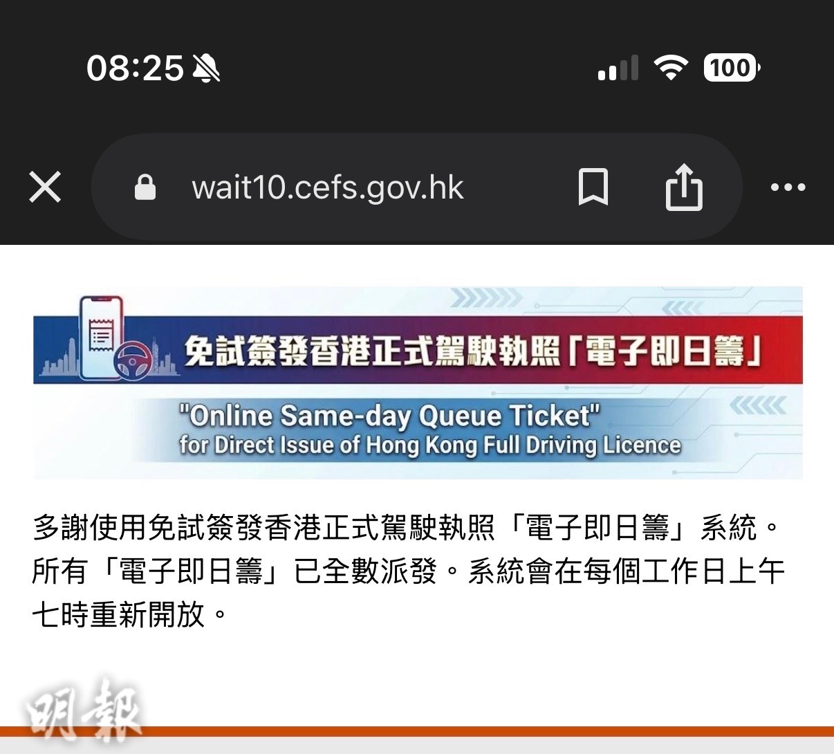 即時港聞 免試簽發駕駛執照改網上派即日籌 300籌號約半小時派畢 (08:34) 發佈於 2 個月 前 2026 年 1 月 12 日 By 明報 運輸署因應金鐘統一中心的香港牌照事務處有人濫用現場派籌安排,取消免試簽發駕駛執照的現場派籌安排,並於今日(12日)起實施「電子即日籌」。電子派籌實施首日,所有電子籌約半小時內已派發完畢。 相關文章:免試駕駛執照編輯推介運輸署 Up Next 鑽石山私家車小巴相撞 3人輕傷送院 (23:21) 不要錯過 港鐵:藍田站至調景嶺站電纜跳掣 列車服務一度延誤 (08:21) 繼續閱讀 贊助商 猜你喜歡 11政府停車場下月加租 運署:已考慮多項因素 安全帶解不開困客45分鐘 揭鎖扣被塞錫紙 城巴報警 運輸署指香港山多路窄 短途巴士也會登上公路 戴安全帶規定難有例外 (11:23) 陳美寶:爭取盡快推出全面網上預約免試簽發櫃位服務 (13:26) 的士4月1日起須提供電子支付 違者最高罰5000元、監禁半年 (16:29) 流動電訊裝置新例Q&A|駕駛座前方周日起最多兩部通訊裝置 手機平板屏幕同受限 (15:35)