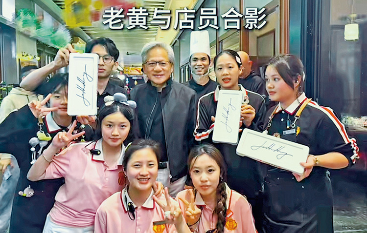 上周來華的黃仁勳已先後到訪上海及北京。據《深圳特區報》,黃仁勳前天與6名朋友到深圳福田CBD,吃了一頓潮汕鮮牛肉火鍋。最後埋單800多元(人民幣,下同),黃仁勳讚歎「深圳的牛肉,很新鮮,很好吃。」用餐結束,他熱情與店員合影,並應邀在三個餐盤上簽字留念。