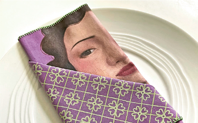 進入廚房,最顯眼的是一系列彩繪餐巾,陳佳婷的油畫女子半遮半掩在雕花窗欄後。雕花的樣式,在中峇魯現實中依然存在,而那些女子雖非實際人物,卻也有來歷。中峇魯曾是傳說中過去富商安置情婦的「美人窩」,這些女子就彷彿娃娃屋的收藏品一樣,所以這個系列就叫《娃娃屋》。她們這樣被放置在餐盤上,美麗卻脆弱,或者被用過即棄。更諷刺的是,此系列首次展出時就被人搶購,她們被消費,一再被消費。