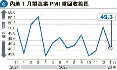 【明報專訊】國家統計局公布,內地1月製造業採購經理指...