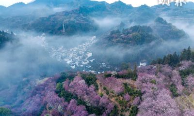 內地多處梅花盛放,景美如畫。安徽黃山賣花漁村漫山梅花...