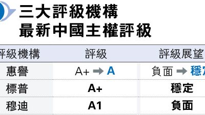【明報專訊】評級機構惠譽將中國主權信用評級由「A+」...