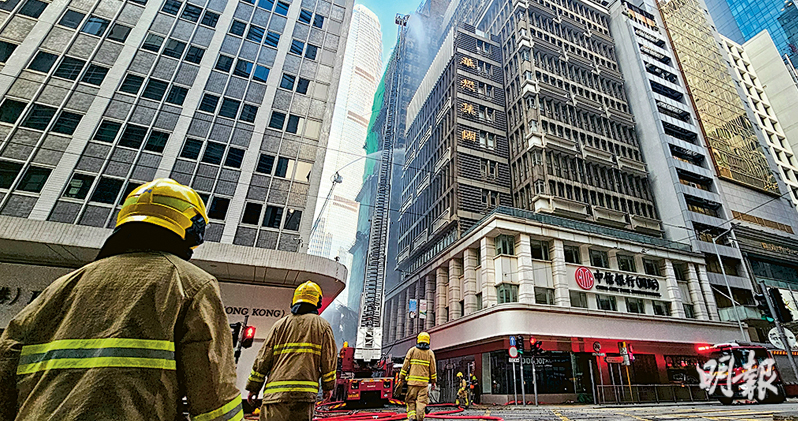 【明報專訊】中環華懋大廈昨午發生三級火,火勢沿外牆竹...