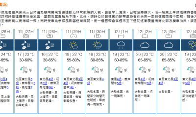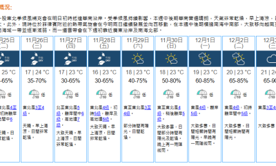 天文台表示,本港周二(25日)漸轉天晴。早晚市區最低...