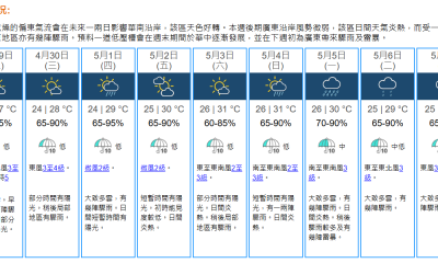 天文台表示,明日(5月1日)有幾陣驟雨。早上短暫時間...