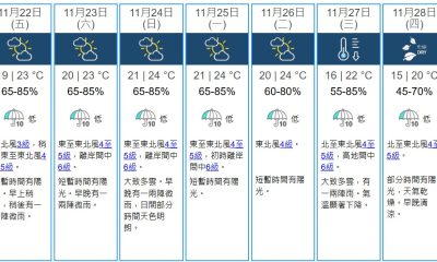 【19:45】天文台預測,本港地區今晚(22日)及明...