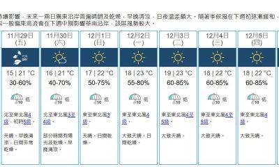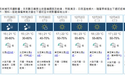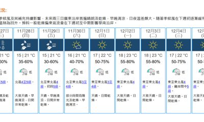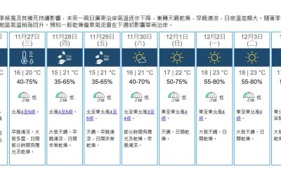 【16:17更新】一股達強風程度的東北季候風會在周日...