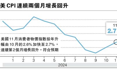 【明報專訊】美國通脹回落的進程陷於停滯,11月消費者...