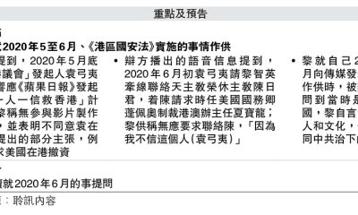 【明報專訊】辯方昨早續就黎智英2019至20年發表的...